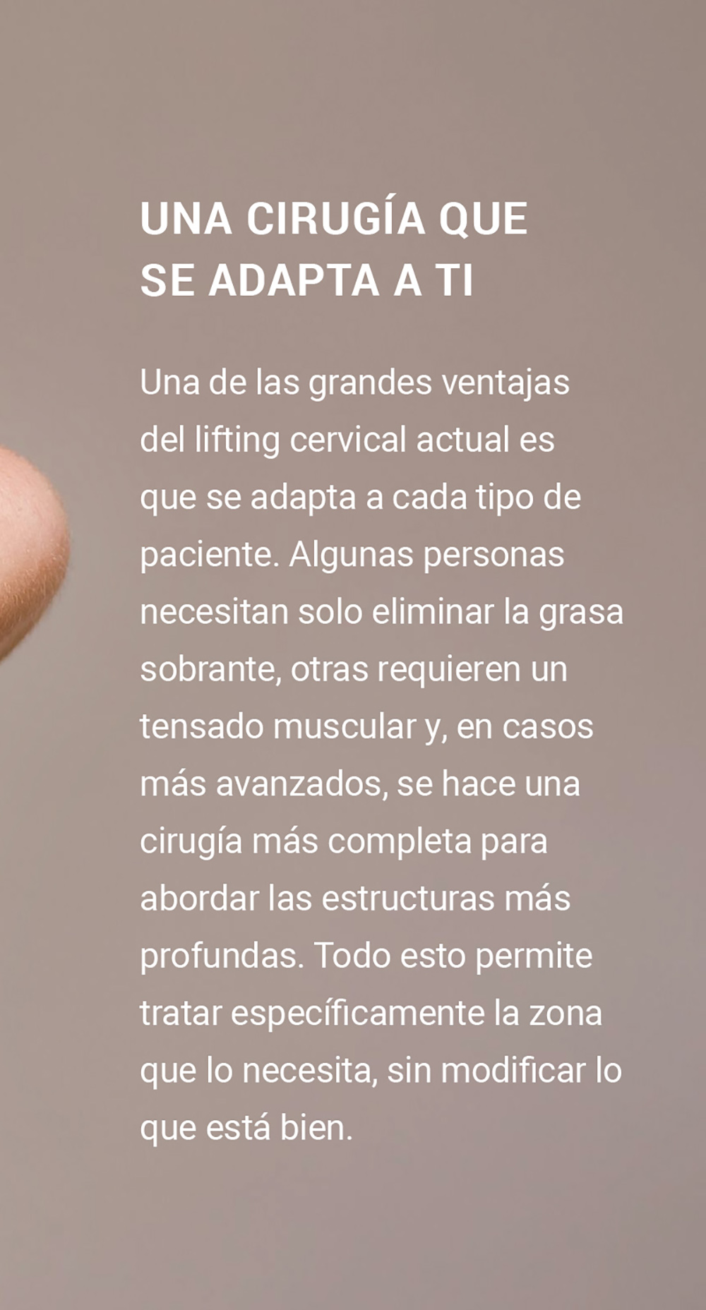 Las personas con anatomías desfavorables en el tercio inferior de la cara o que envejecen más rápidamente en esta región, el lifting cervical permite corregir la papada o la flacidez del cuello sin cambiar radicalmente la apariencia facial.